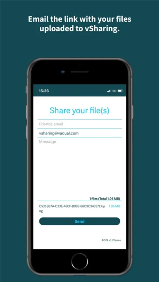1) Click and select the source for sending (Photo Library, Take Photos or Videos, choose a Files). Select the files and add them to the upload, you can add more even after checking for upload, always with the same method (Photo Library, Take photos or videos, choose a Files).