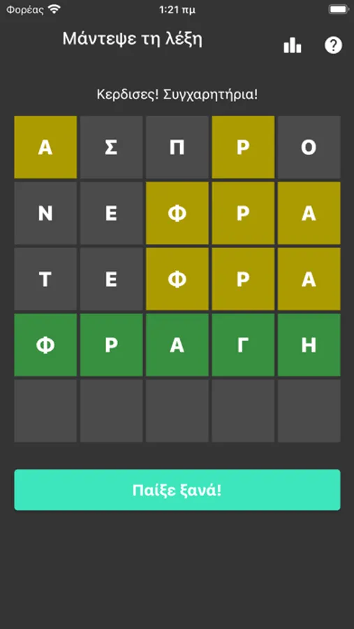 Μετά από κάθε προσπάθεια το κάθε γράμμα θα γίνει πράσινο, κίτρινο ή γκρι.