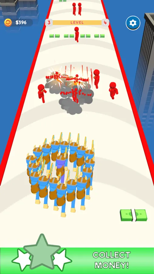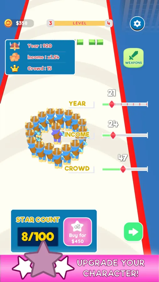 Run through the platforms with as many allies as possible to defeat the boss in the end! Manage your era, income and the amount of number your crowd has and increase your chances!