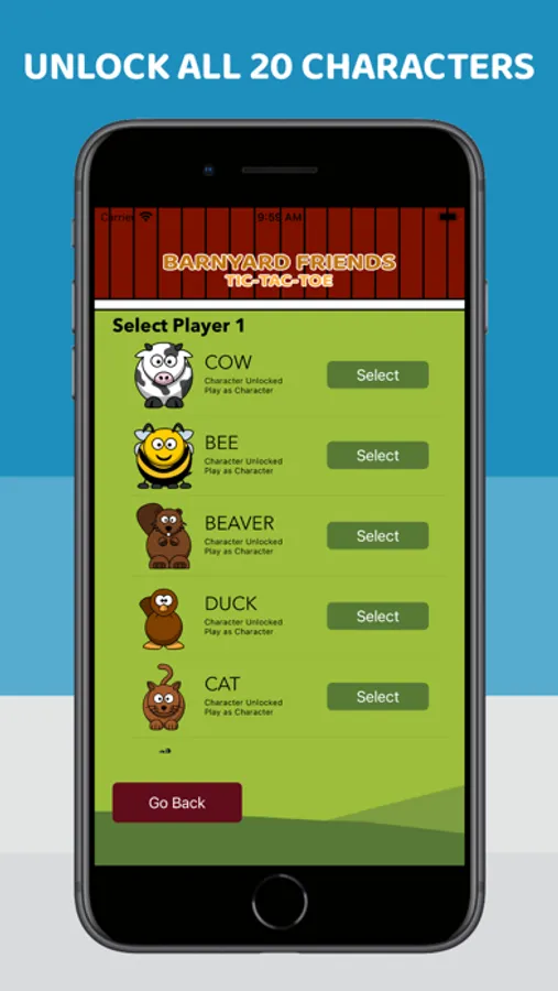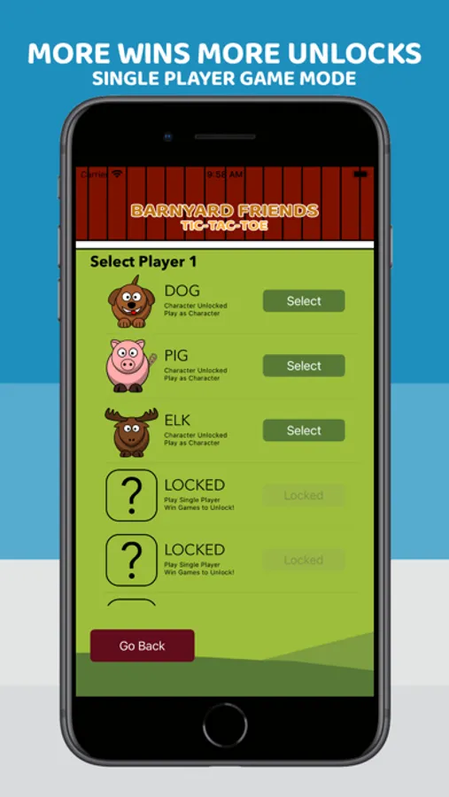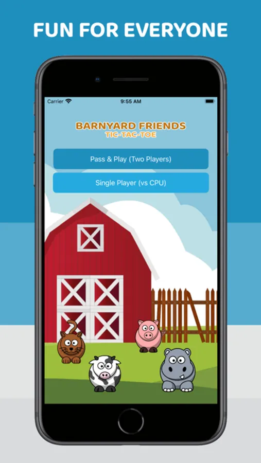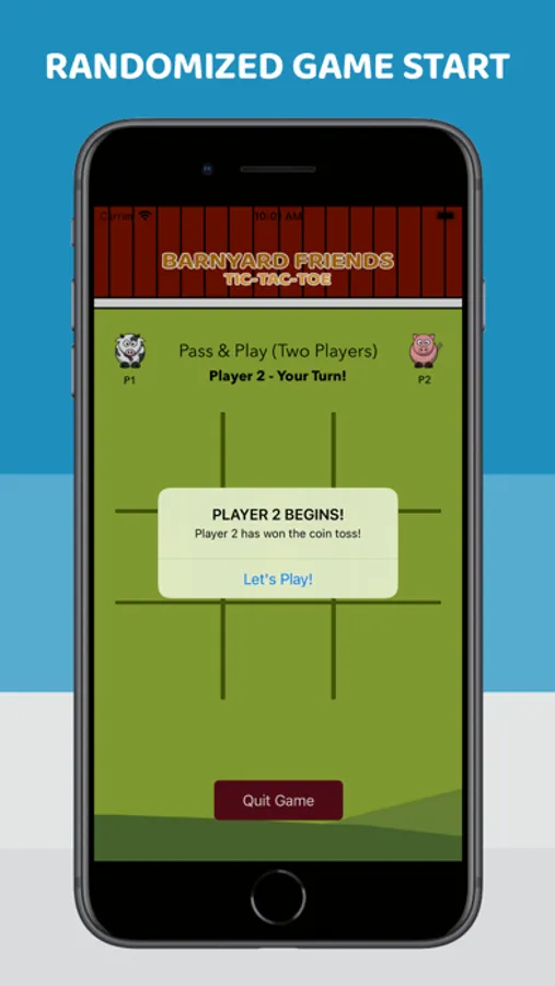 Classic Game of Tic-Tac-Toe with twist of a barnyard theme! Beat the computer and earn wins to unlock characters to be used in all game modes. Have fun with the family or friends on game night, long rides, or whenever you have the urge to play some tic-tac-toe. The game randomizes which player goes first so each player including the computer has a fair chance at starting the game!