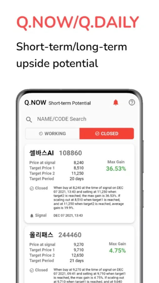 We provide a Q.DAILY service that aims to reach a target rate of return stably within D+15 trading days by investing in a 4-5 day swing technique, and a Q.NOW service that seeks profits within a few hours by quickly responding in real time with a rather high risk.