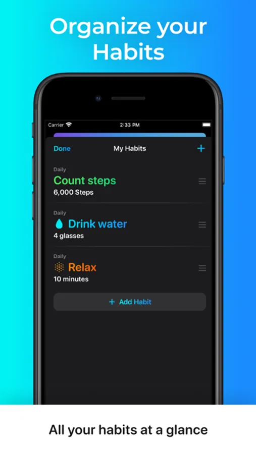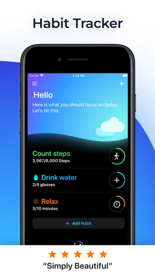 Meet Habits, simply the best app to build powerful, life-changing habits and routines. Easily create new habits and track your progress with cool charts and awards. Create custom reminders to be active, productive, and add structure to your day.