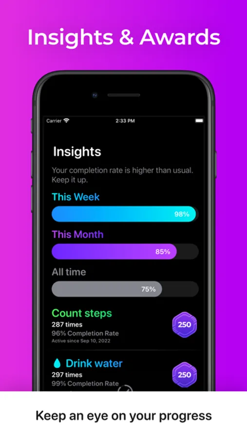 Quickly check your daily progress, analyze your overall performance and see where you can improve. Earn awards to prove you`re on the right path to a healthier, more productive life.