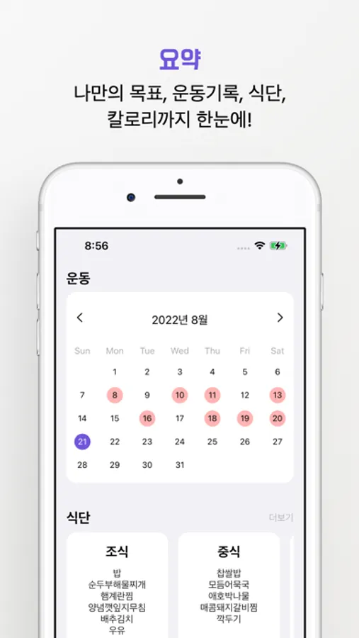 - 부대별 식단 칼로리 정보를 통해 섭취 칼로리를 계산하고 이를 소모 칼로리(기초대사량, 운동 칼로리)와 비교하여 확인할 수 있습니다.