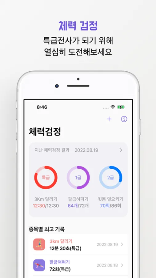 - 장병 개인의 체력검정 기록 및 등급을 저장할 수 있습니다.