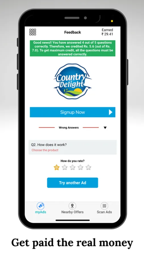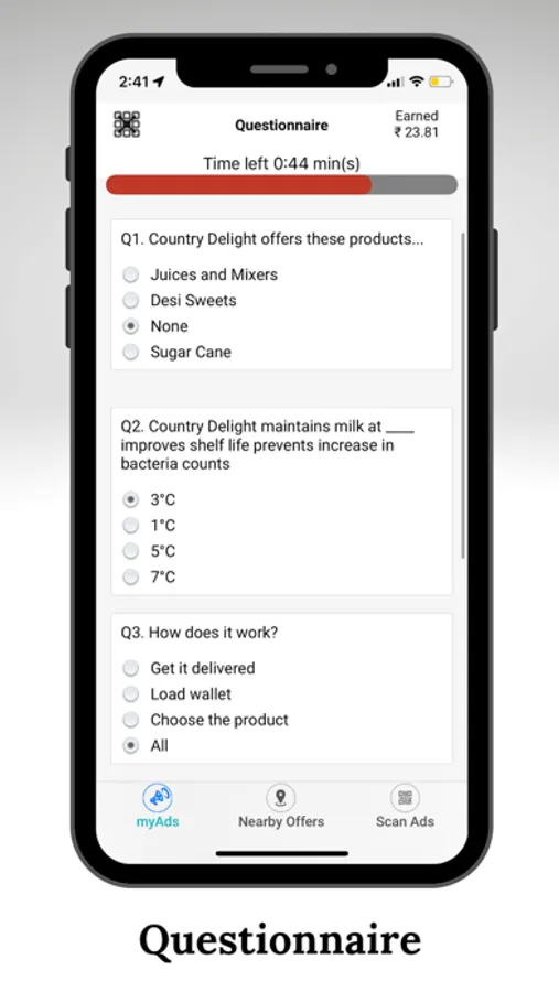 In my ADs, a person can select a topic, watch a video or read the description regarding it, which prepares him to answer the questionnaire that follows. Each question has a price tag attached which is paid to the person in terms of mobile recharge.