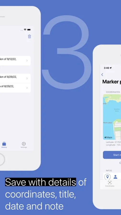 • You have the possibility to save all your coordinates in a history synchronized with iCloud. You can assign an emoji to each of your favorite locations: home, work, sports, favorite coffee shop and more.