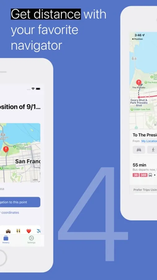 • When you are located, you can get the distance and travel time to another target location. This works on Maps or other GPS navigators.
