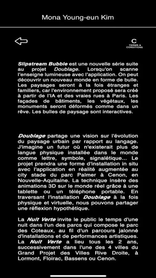 Le projet Doublage partage une vision sur l’évolution du paysage urbain par rapport au langage. J'imagine un futur où n’existerait plus de langue physique installée dans le monde comme lettre, symbole, signalétique... Pour inviter le spectateur à un prévoyage de cet avenir, le projet aura pris une forme d'installation in situ avec la technologie de réalité augmentée dans le terrain basket-ball au parc Palmer à Cenon, Nouvelle-Aquitaine. La technique insère des animations 3D sur le monde réel grâce à une tablette ou un portable de visiteur. En traversant l’installation Doublage à la fois réels et virtuels, nous pouvons découvrir les couches de perception en fonction de l’accessibilité de la technologie et partager une réflexion hypothétique.