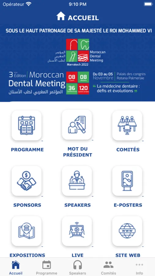 L’Ordre National des Médecins Dentistes du Maroc s’honore d’organiser sa troisième édition du Moroccan Dental Meeting M.D.M.2022 et c’est avec un immense plaisir qu’il donne rendez-vous à tous les professionnels de la médecine dentaire pour se retrouver à nouveau du 03 au 5 Novembre 2022 au Palais des congrès Rotana Palmeraie Marrakech