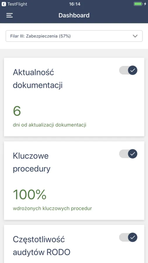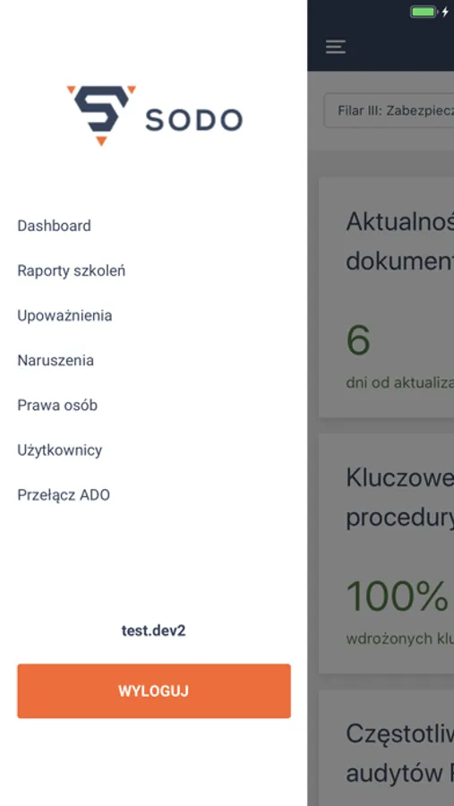 Aplikacja mobilna SODO to narzędzie do zarządzania i monitorowania zgodności z RODO w firmie i urzędzie. Poziom zgodności z RODO zwizualizowany jest za pomocą czytelnego dashboardu. Został on opracowany zgodnie z naszą autorską koncepcją V Filarów, która znacznie ułatwia zrozumienie kluczowych obszarów zgodności z RODO.
