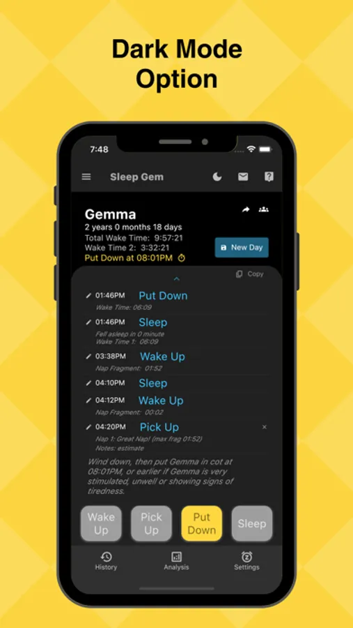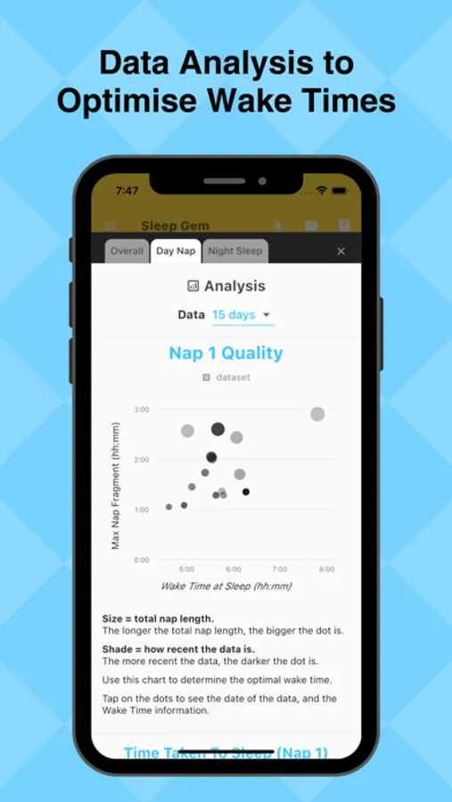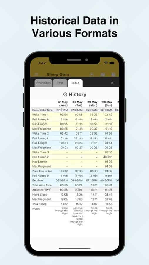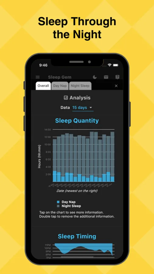 Featuring user-friendly charts and tables, Sleep Gem allows you to easily visualize and analyze your baby's sleep patterns over time. Our goal is to empower you with knowledge, helping you make informed decisions for your baby's sleep schedule and routine.
