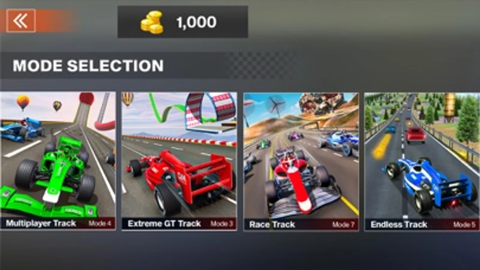 Different car selection options like formula cars and sports cars.