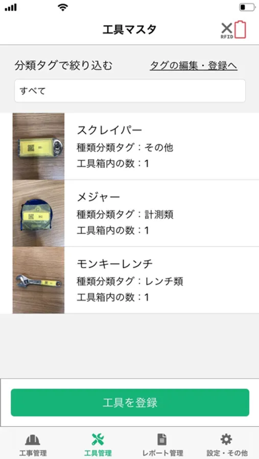 RFIDリーダーより読み取りをした工具情報を工具ミッケアプリにて一括管理します。