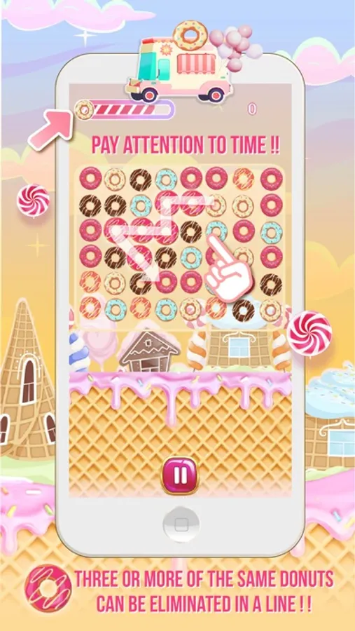 In Sweet World Donut, you’ll need to connect at least 3 identical patterns to eliminate, the more