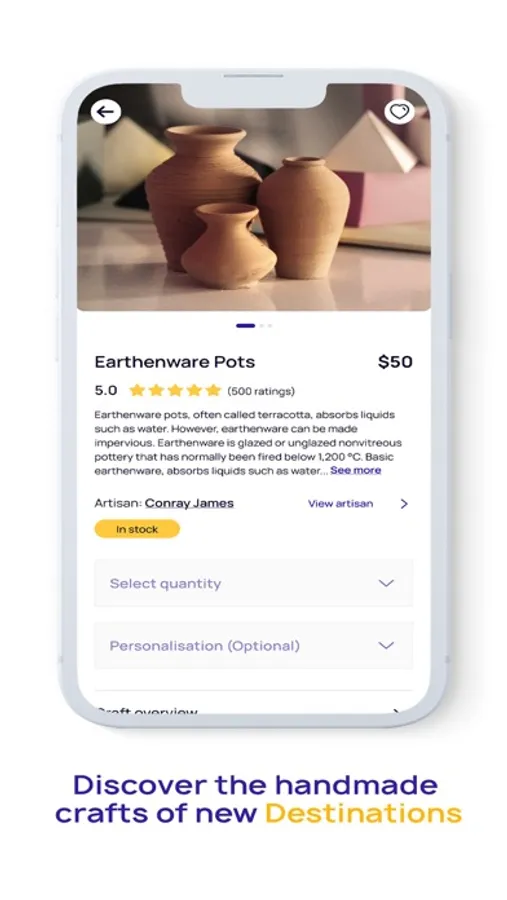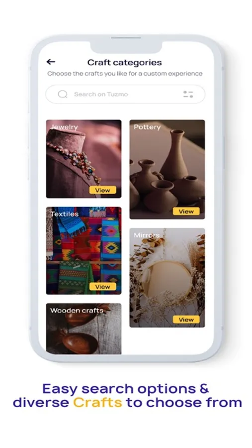 Easily explore our categories to find the perfect cultural keepsake for you whether you are a tourist, traveler, or home-shopper. You can buy it right in the app. You will find crafts ranging from ceramics, glass crafts, woodwork, leather art, and fiber art, to jewelry, calligraphy, and much more.