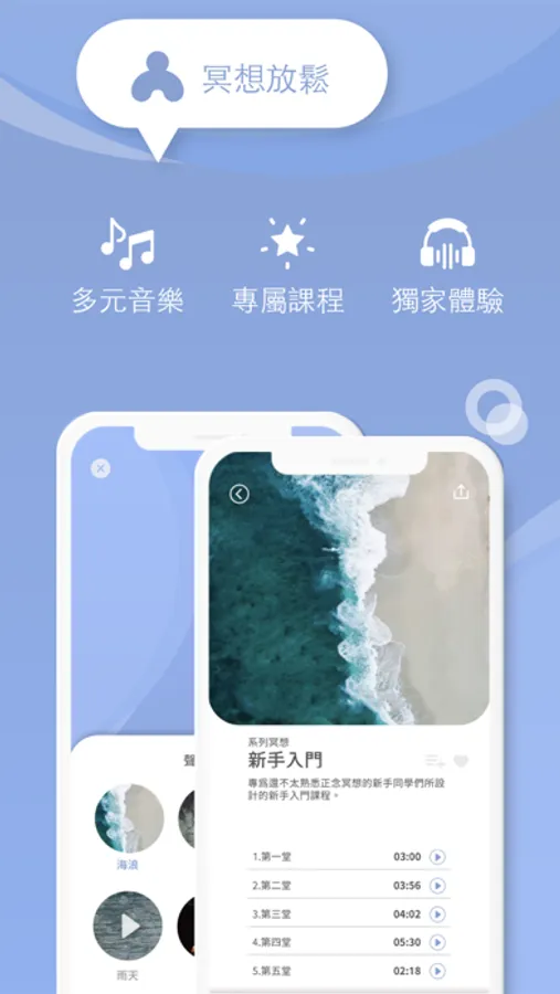 我們提供全球瘋行、科學證實對大腦有益處的放鬆方式,包括正念冥想課程、瑜珈課程、睡前故事、白噪音樂、獨家專區 (知識型網紅/藝人的分享)。