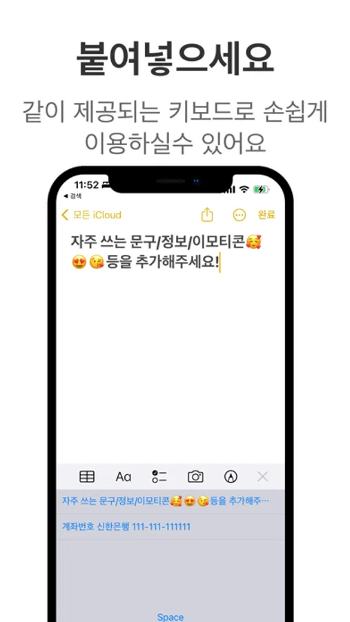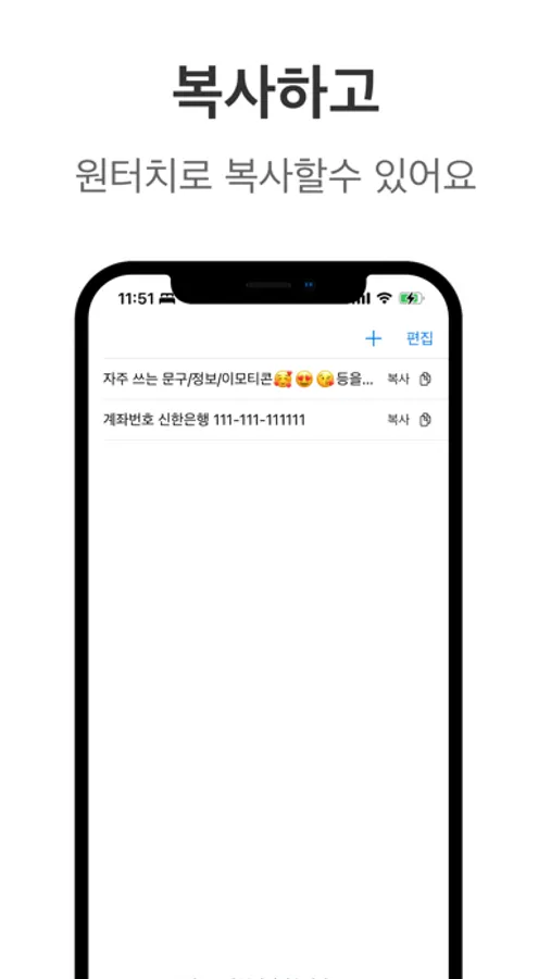 자주 사용하는 문구/정보/이모티콘등을 손쉽게 복사하고 붙여넣으세요!