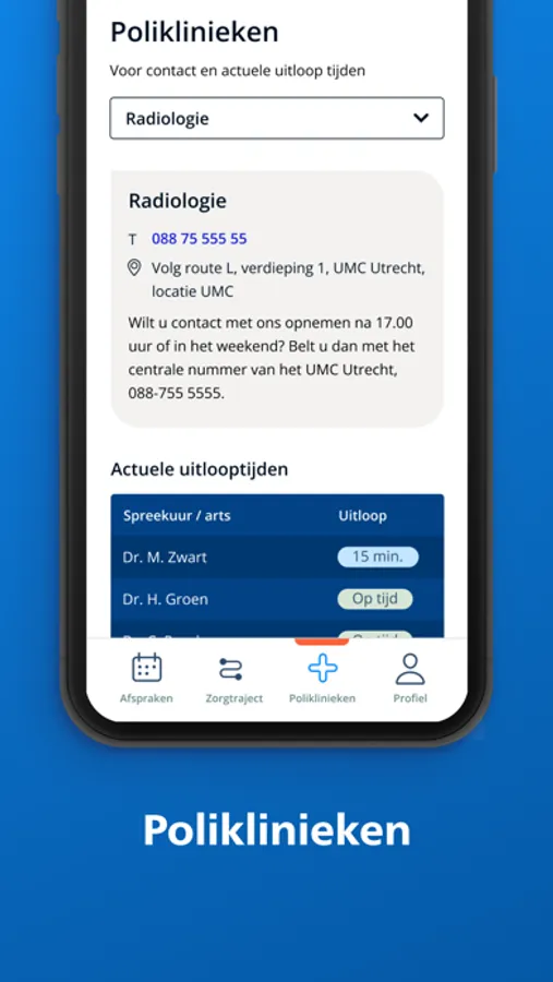 Deze app in ontwikkeld voor patiënten van het UMC Utrecht. In deze app kunt u contactinformatie over poliklinieken vinden. Daarnaast wordt een beperkt aantal zorgtrajecten ondersteund. Daarnaast kunt u een operatiedatum invullen zodat u een extra herinnering krijgt dat u nuchter moet zijn. Deze app is in ontwikkeling en zal steeds meer functionaliteiten en informatie gaan bevatten.
