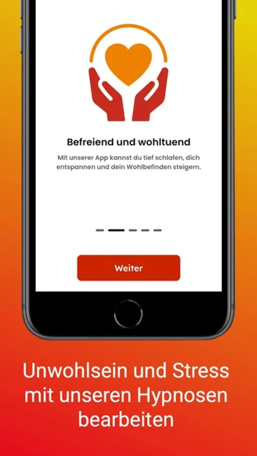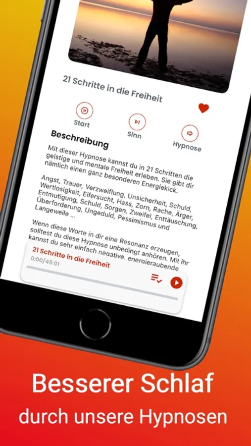 Mit den vielen Hypnosen in unserer App kannst du dein Gedankenkarussell anhalten, liebevoll ohne Jo-Jo-Effekt abnehmen und eine gesunde Beziehung zu Stress und Sorgen entwickeln, um deine Zufriedenheit und Wohlbefinden im Leben zu fördern.