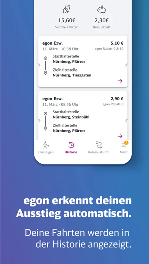 Vielfahren lohnt sich: Je mehr du innerhalb von 31 Tagen mit egon fährst, desto günstiger werden die nächsten Fahrten. Damit kann es sich schnell lohnen, öfter Bus und Bahn zu nutzen. Denn jede Fahrt wird für den Rabatt berücksichtigt – der Weg ins Büro ebenso wie dein Wochenend-Ausflug in die Fränkische Schweiz.