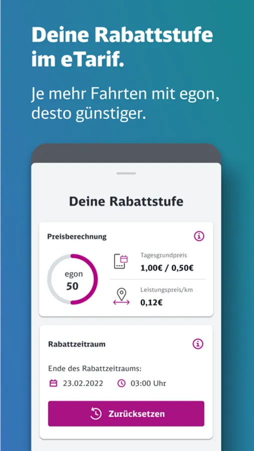 Einsteigen und zurücklehnen: Du brauchst nur die App vor der Fahrt einmal aktivieren. Danach kannst du beliebig oft umsteigen. egon erkennt Fahrzeugwechsel automatisch – und auch das Fahrtende. Für die Abrechnung werden alle Fahrten summiert und am Ende von 31 Tagen abgebucht.