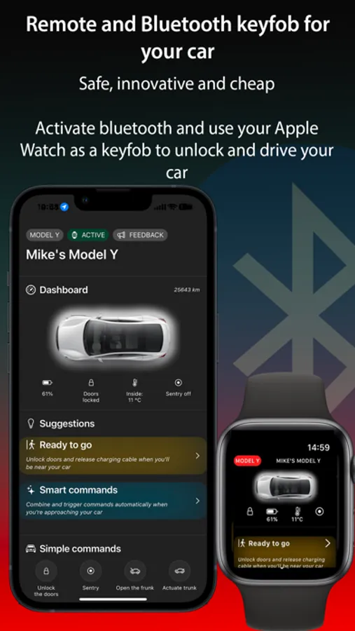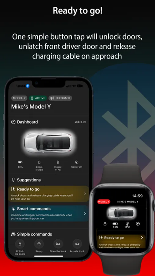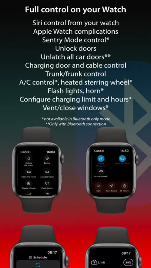 - Check your vehicle status and trigger basic commands on your watch: unlock doors, toggle sentry mode, AC, schedule vehicle charging...