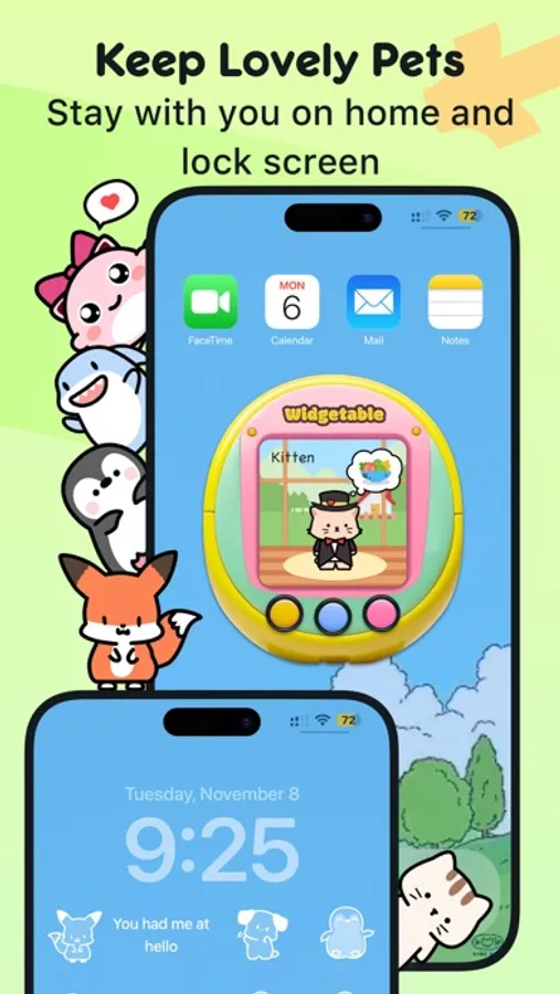 You can raise lovely pets on your lock and home screen. As your loyal virtual friends, they will always stay with you and randomly share their life to make you smile. Don't forget to take care of them frequently so that they can stay clean and cheerful! You can also bind your friends or partner for co-parenting and raise pets together!
