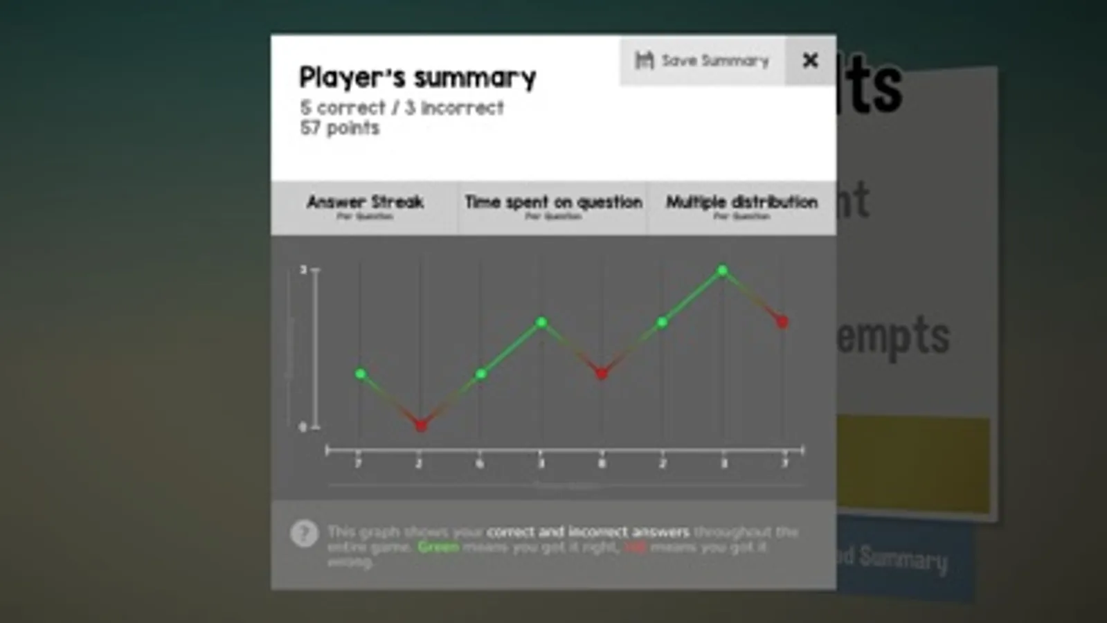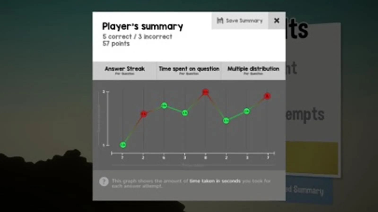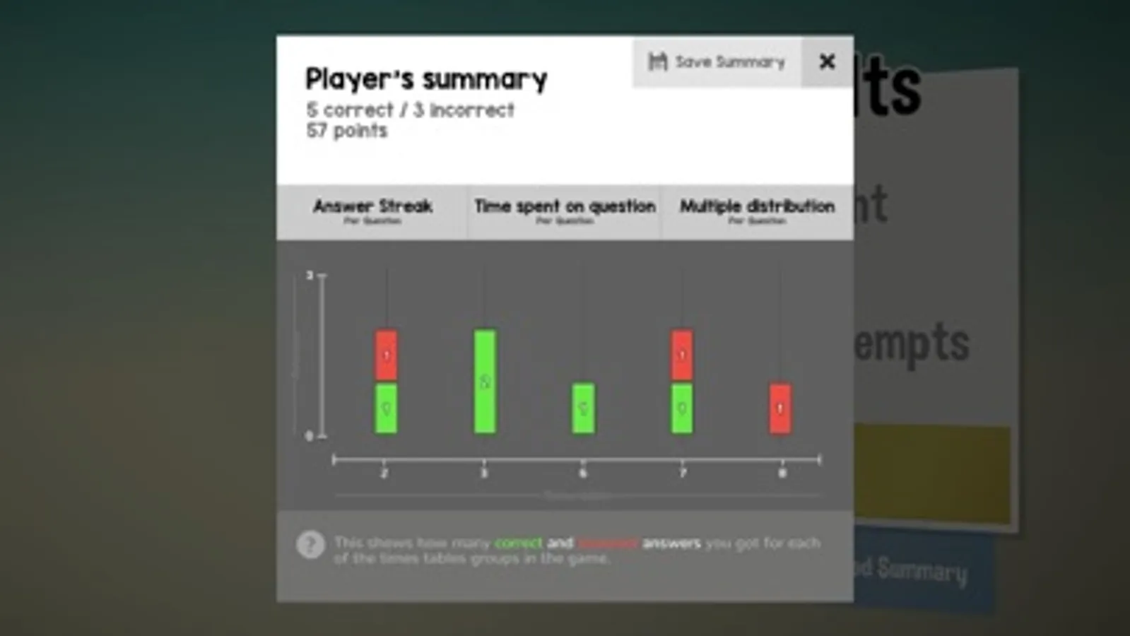 At the end of each game, you can choose to see a detailed summary of the run which will have information presented in a range of graphs allowing you to track the speed of recall and will highlight any particularly troublesome multiplication tables for the child playing.