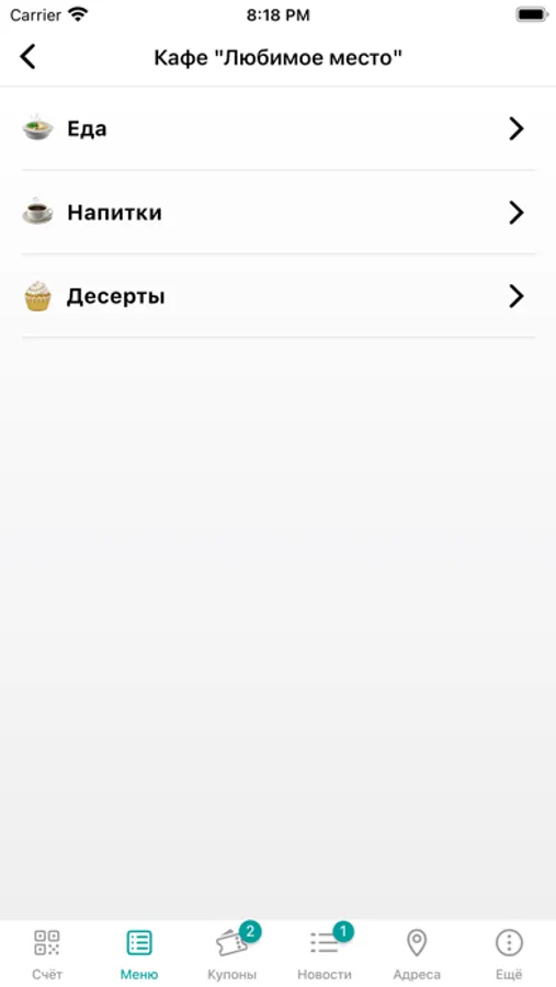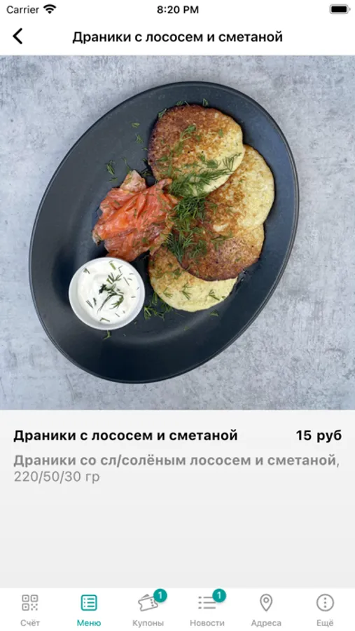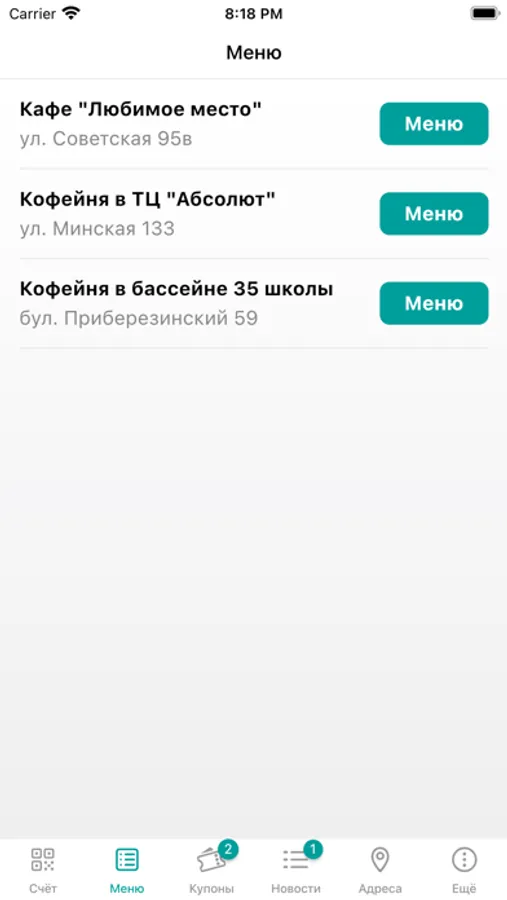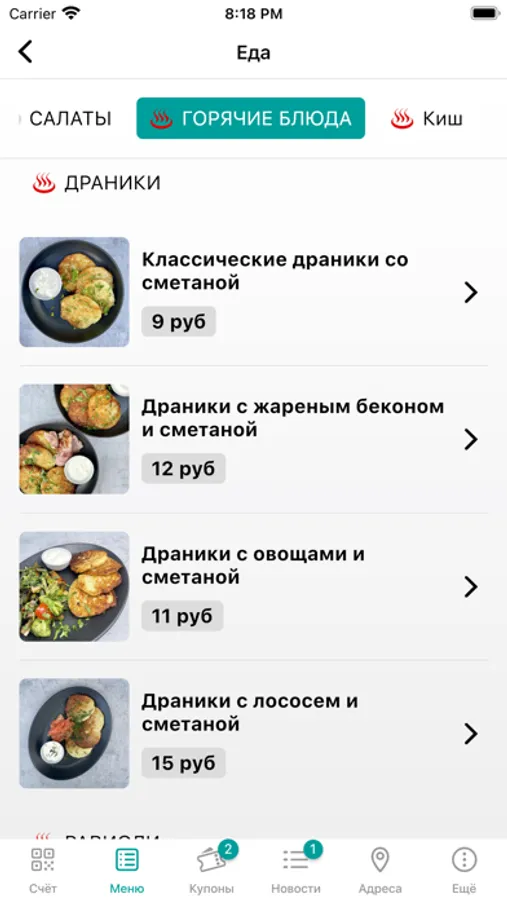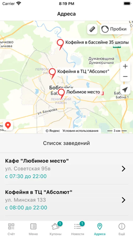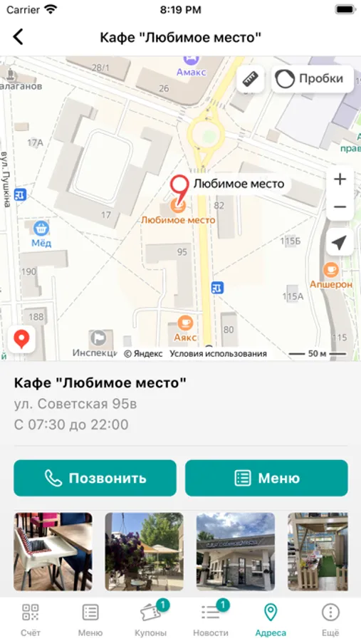 - посмотреть актуальное меню с ценами по каждому заведению;