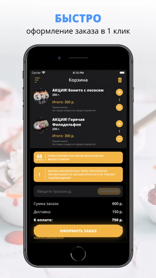 Скачивайте наше приложение, оформляйте заказ и наслаждайтесь любимой едой, где бы Вы ни были! Приятного аппетита!