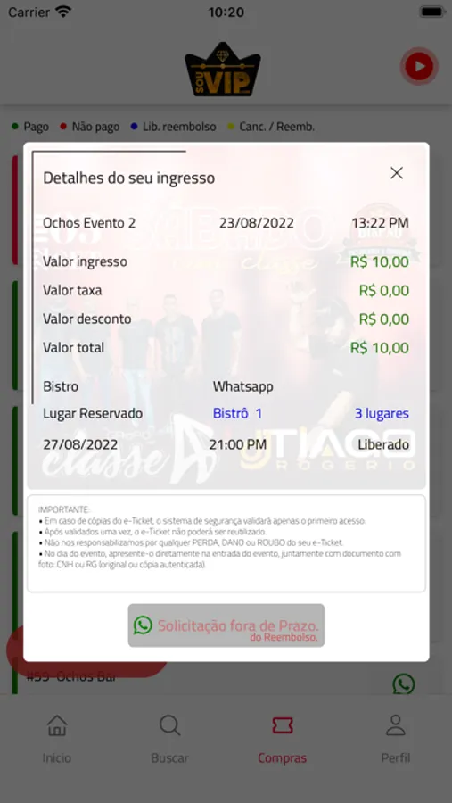 Os ingressos que você comprou via app fica armazenados nas compras e podem ser acessados offline para que você entre no evento sem precisar de internet. Não enviamos ingressos por e-mail, isto garante que apenas você terá acesso ao ingresso comprado.