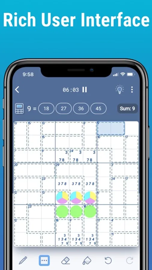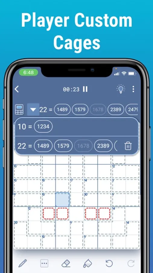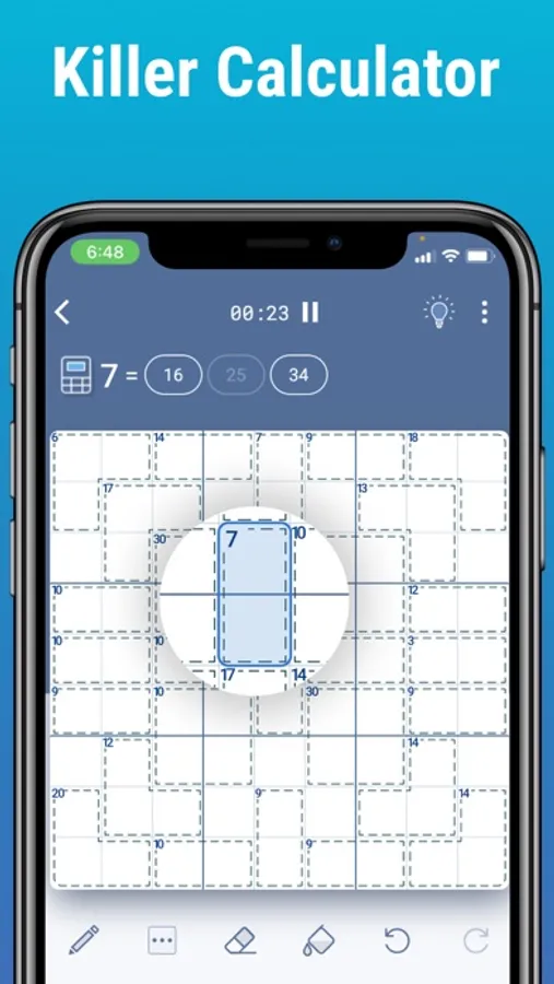 The puzzles are beautifully handcrafted and divided into 6 playing levels from Beginner to Master. The app comes with a great interface and tools for novice and professional solvers, like: Hidden(virtual) cages creator, combination panel, killer calculator, double notation.