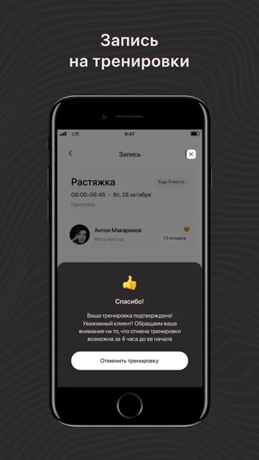 Отменить запись, но не ранее чем за 6 часов до начала тренировки;