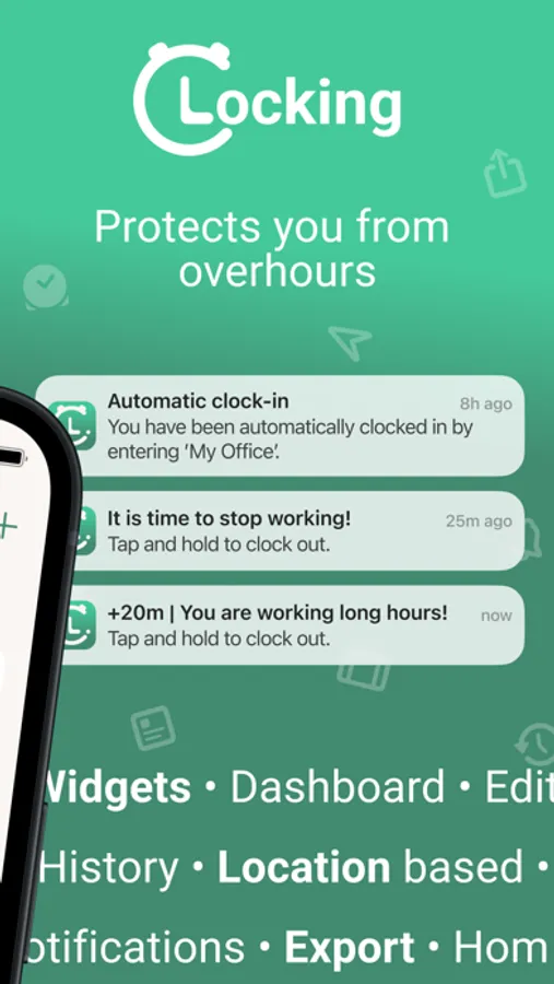 The app is designed to make it as easy as possible to track work times. Without complicated screens, easy to use by the everyday user. Setting up the app is a piece of cake, and with the Premium automatic clock-in feature, widgets & notifications, you would not even need to open the app.