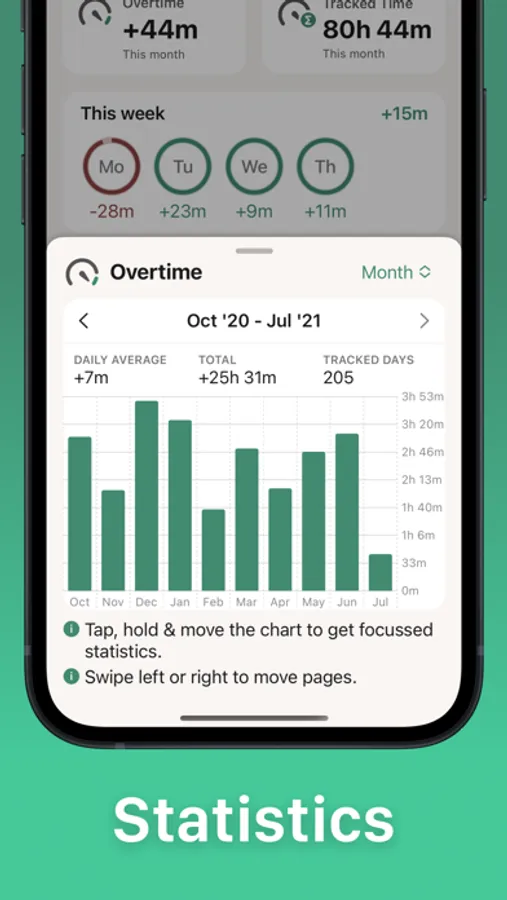 Easily access your past work hours organized by week, and conveniently add or adjust them as needed. Get a glimpse of your overtime from the past month, quarter, or year, and explore them through detailed graphs.