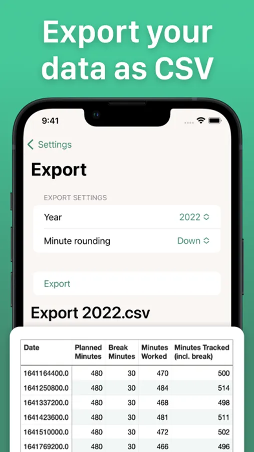With a Premium subscription, you can export your worked minutes per day to a CSV file. You can import that data in e.g. Excel.