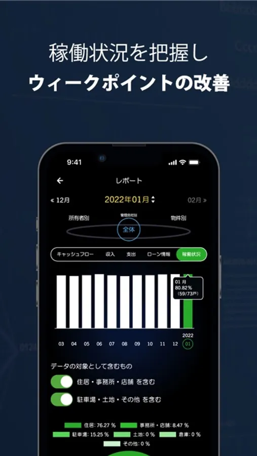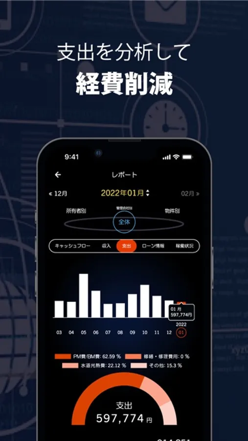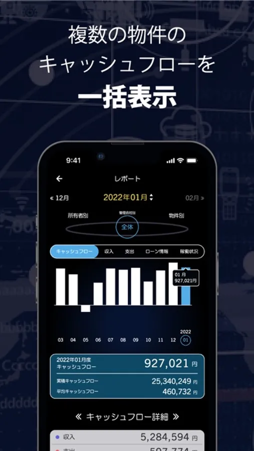 - CF / 収入 / 支出 / ローン情報 / 稼働状況の5つに分けて情報を見ることができる。