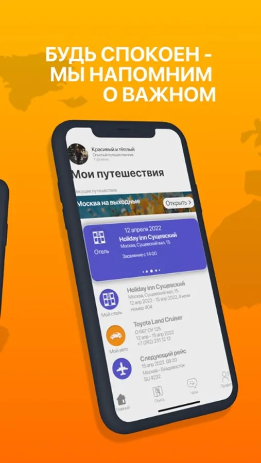 Каждый этап напомнит о себе заранее, каждый необходимый документ может быть подгружен к этапу и всегда будет под рукой, расчёт времени подскажет, что вы не успеваете поменять аэропорт и предложит альтернативу — или увидит много свободного времени и подскажет, как его провести!