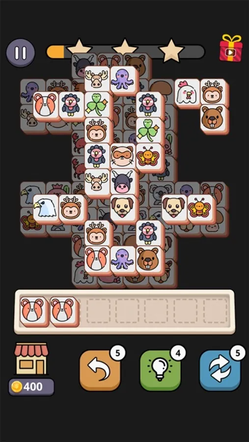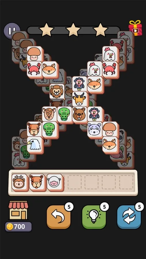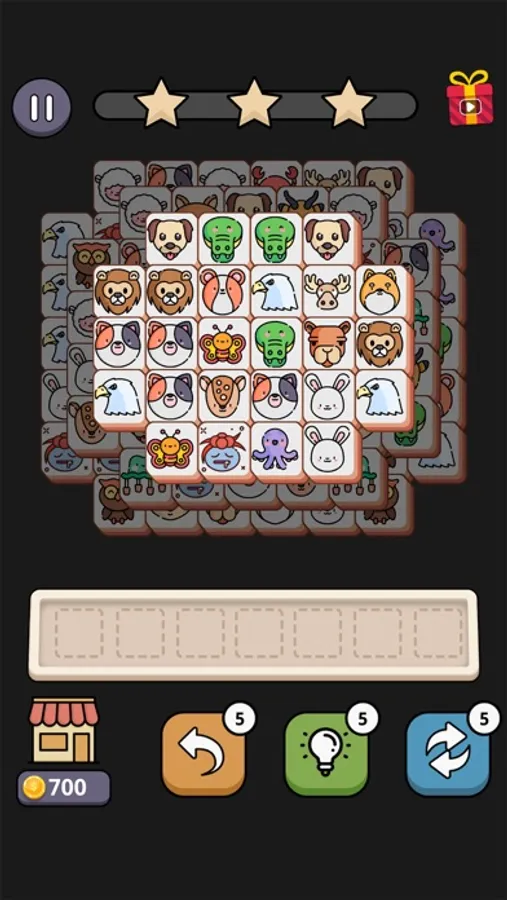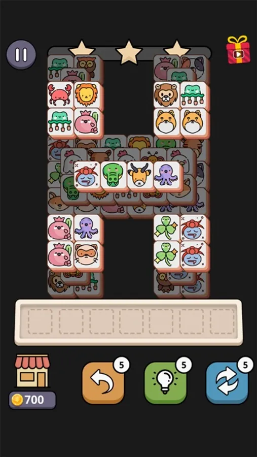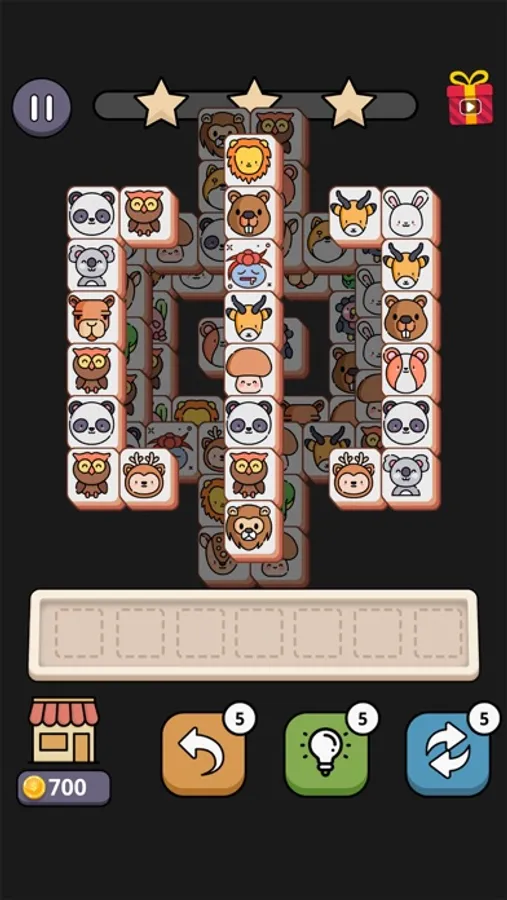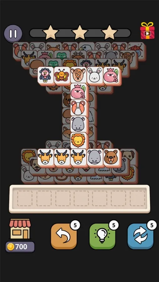 The game beings with a board filled with different tiles with animals drawn on them. Every level, will have 3 tiles with the same animal image. At the bottom of the screen, there is a board to hold the tiles you select. There is space enough for 7 tiles to fit in at a time. When you tap on a tile in the puzzle, it will move to an empty space in the board at the bottom. When there are 3 tiles of the same image in that area, these tiles disappear, leaving room for more tiles. Because there is only limit space tiles at a time, you must be careful as to not tap on tiles at random. You should only tap on a tile, if you are sure that you can match 3 tiles with the same animal image. Otherwise, you’ll fill the board with a bunch of random tiles and you won’t be able to add more tiles once the space if filled. When the board is full of tiles, it is game over. So, focus on tile matching and enjoy the relaxing game.