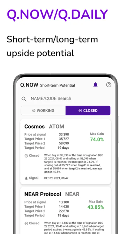 We provide a Q.DAILY service that aims to reach a target rate of return stably within D+15 trading days by investing in a 4-5 day swing technique, and a Q.NOW service that seeks profits within a few hours by quickly responding in real time with a rather high risk.