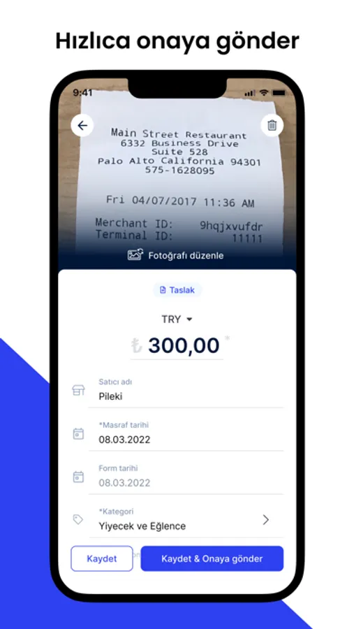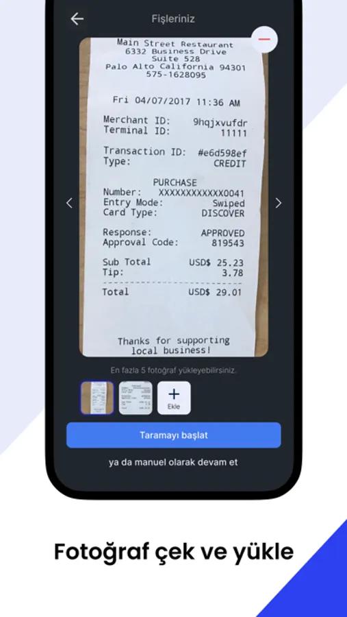 1. Çalışanlar fişlerinin fotoğraflarını çeker ve yapay zekâ destekli tarama sistemi masrafın otomatik olarak oluşmasını sağlar.