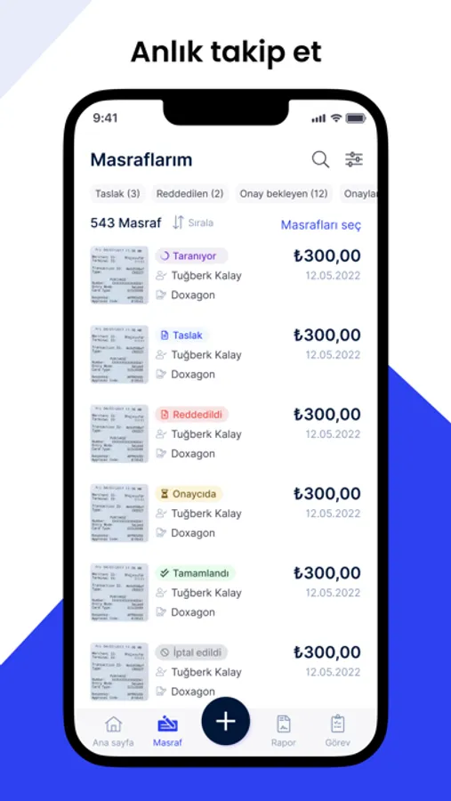 Çalışanlarınız, masraflarını zaman kaybı olmadan kolay bir şekilde size iletebilir. Yönetim olarak masraf giderlerini anlık olarak takip edebilir ve kontrol altında tutabilirsiniz.