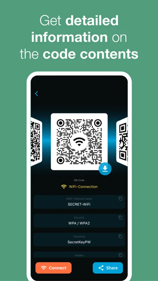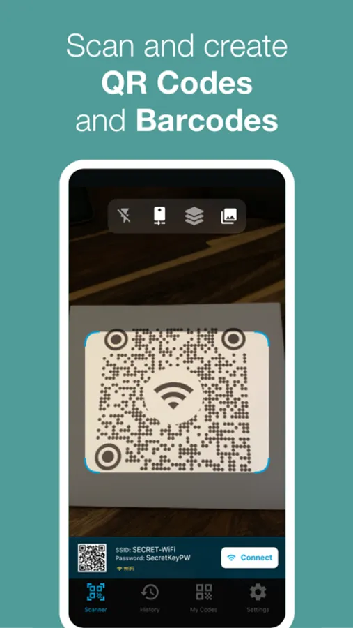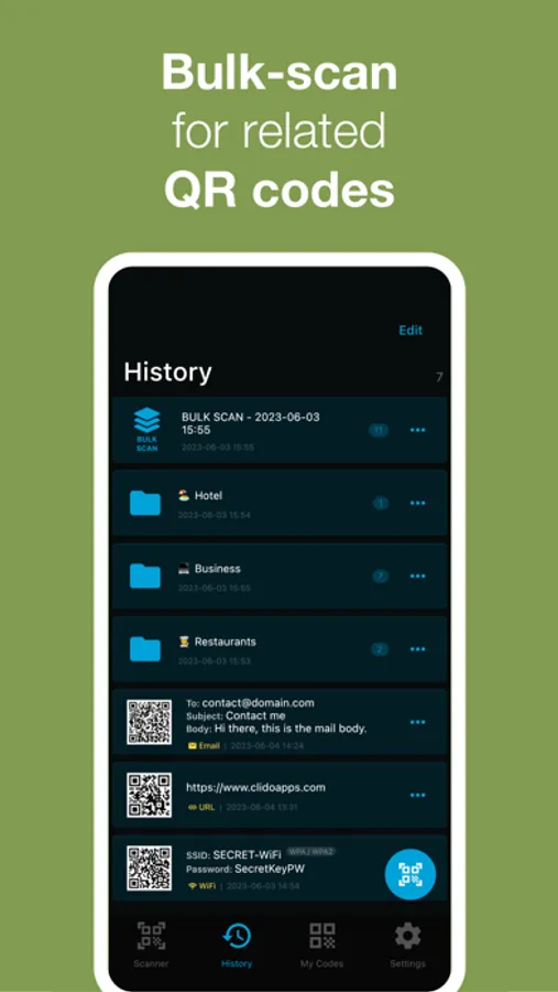 You can create and manage QR codes directly in the app for various themes, such as WiFi, URLs, business cards, events, cryptocurrency, and more.
