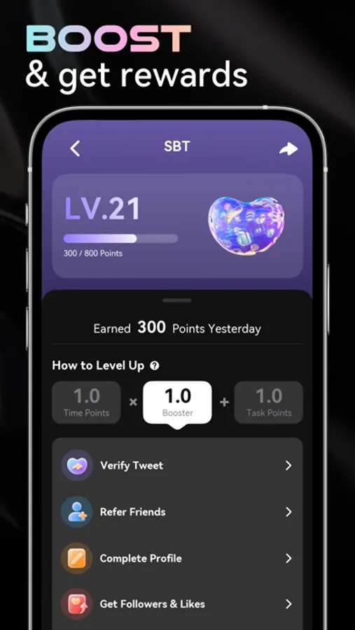 Your SBT serves as your digital passport in NUWA's metaverse, housing all your social data. Elevating your SBT translates to leveling up your social status in NUWA, granting you access to more opportunities. Completing in-app tasks such as chatting, posting and sharing content, inviting new friends, and connecting with potential soulmates earns you points towards leveling up. Every click counts as a mechanism for leveling up.