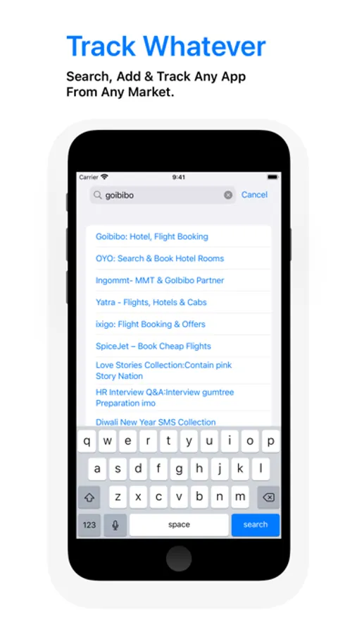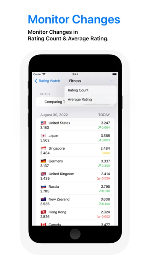 Just search your for app and tap to add it in your tracking list. Track any number of apps. Compare Rating Count and Average Rating data of 174 countries between two dates. Unlike App Store Connect, Rating Watch tells you Average Rating by three decimal places.