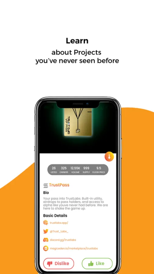 Did you find an NFT collection, DAO, or Web3 company that you're interested in? Swipe right on the project to save it to your "LIKED PAGE" found in your profile page found at the bottom of the app (a profile icon). This "LIKED" project will stay there until you "DISLIKE" it. (New feature: You can now super like by clicking the heart icon when the project is in your liked page. This will keep all super liked at the top for an easier and quick find)