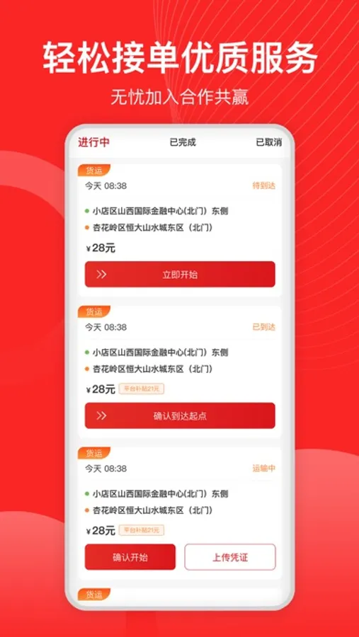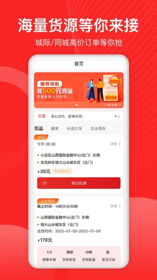 需求。用户一键呼叫搭建,快速、平价、安心、专业的同城、专线货运交易平台。司机实时抢单;企业版提