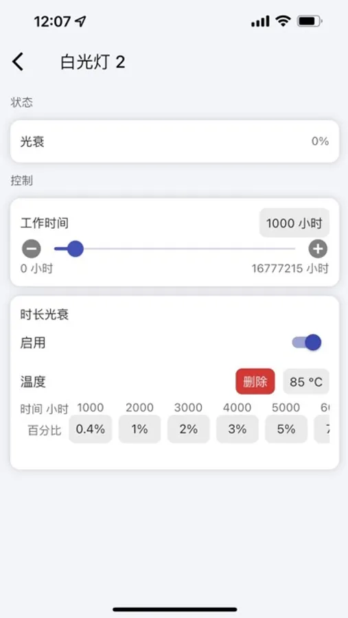 灯具按照0-85℃曲线进行;部分灯具显示异常85℃-95℃曲线进行(地图正常);95℃以上黄色报警更换(地图红色)。