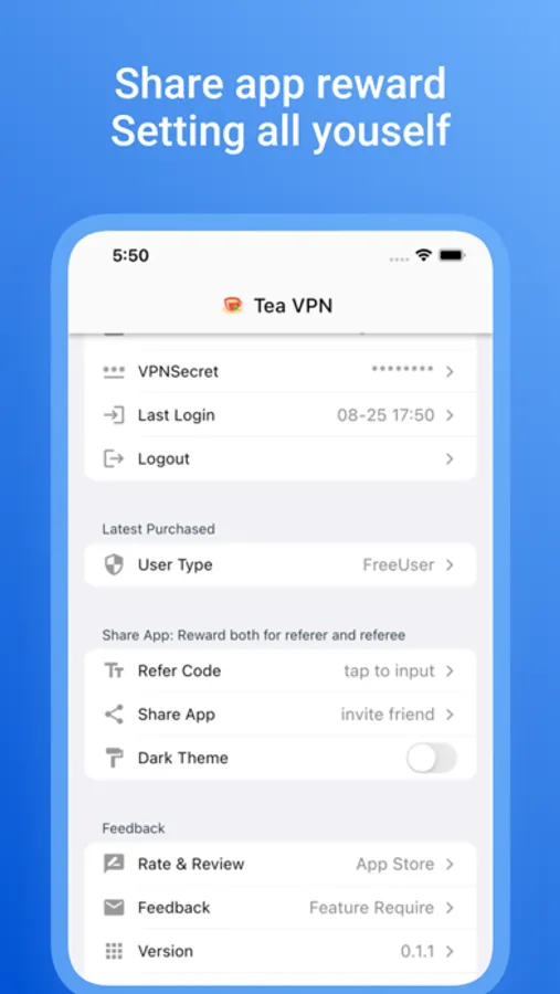 △ Affiliate Code. Usage: Share app and let someone input your code. Both referer and referee get more 1.0GB traffic monthly. FOREVER.